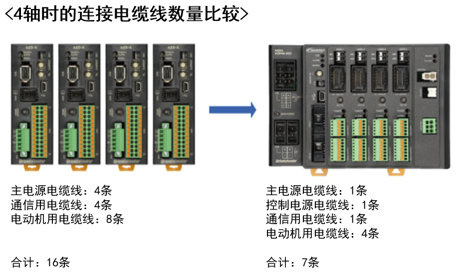 αSTEPAZ系列多軸驅動器,可連接2-4軸。可將驅動器集合成1臺, 可節(jié)省連接上位的連接電纜線及電源電纜線,從而節(jié)省配線。