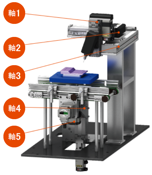 自動給由傳送帶搬送來的工件進行點膠。 通過升降旋轉模組將由傳送帶搬送來的工件上升旋轉至加工位置、利用直交機器人多軸模組(龍門架單元)處理各種尺寸及形狀的工件。 此次的裝置是利用點膠機進行點膠,也可用于其他用途。