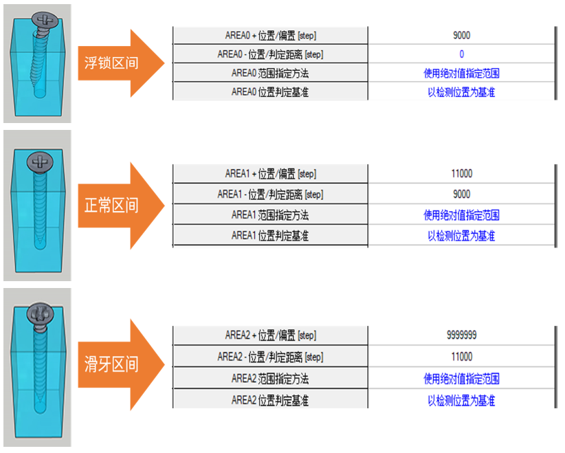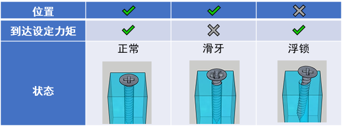 若擰緊的圈數(shù)不對,則可能出現(xiàn)浮鎖或者滑牙的情況,造成工件不合格。 這就涉及到了電機(jī)的位置和力矩狀態(tài),所對應(yīng)螺絲的狀態(tài)如下: