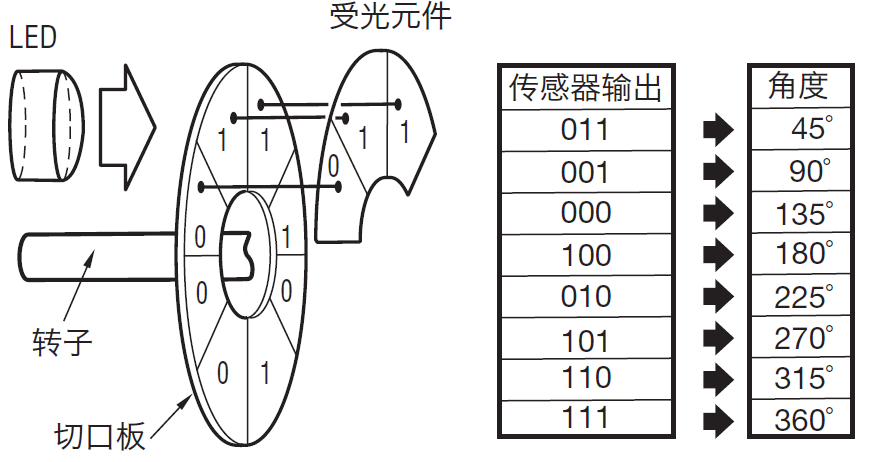 絕對(duì)式編碼器可檢測(cè)電動(dòng)機(jī)旋轉(zhuǎn)一圈內(nèi)的絕對(duì)位置,并輸出旋轉(zhuǎn)角度的絕對(duì)位置。
