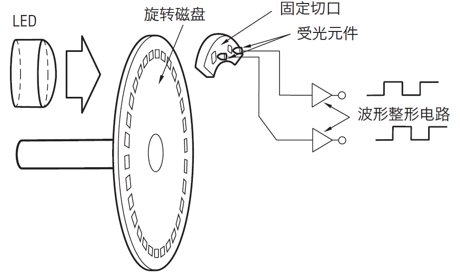 發(fā)光二極管(LED)發(fā)出的光線穿過切口圓盤上的位置檢測(cè)模式,由受光元件讀取。受光元件上集成有數(shù)十個(gè)光電晶體管。絕對(duì)位置檢測(cè)用模式因編碼器的旋轉(zhuǎn)角度不同而全部不同。