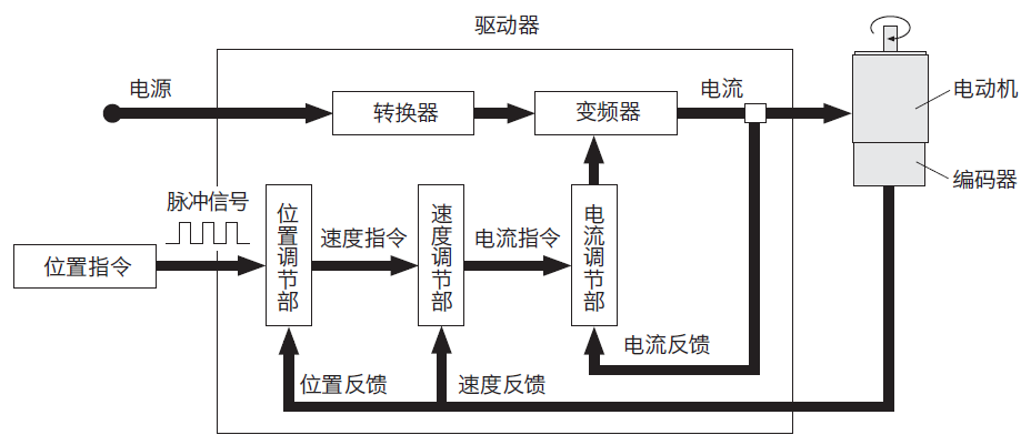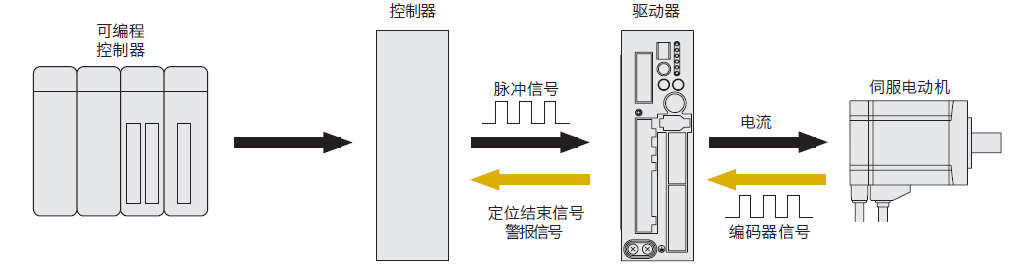 下圖為脈沖型驅(qū)動(dòng)器驅(qū)動(dòng)伺服電動(dòng)機(jī)時(shí)的系統(tǒng)構(gòu)成示例。 電動(dòng)機(jī)搭載旋轉(zhuǎn)檢測(cè)器(編碼器),向驅(qū)動(dòng)器反饋電動(dòng)機(jī)軸的旋轉(zhuǎn)位置/轉(zhuǎn)速。驅(qū)動(dòng)器通過演算從控制器發(fā)出的脈沖信號(hào)(位置指令/速度指令)與反饋信號(hào)(當(dāng)前位置/速度)的誤差,將此誤差控制為0,進(jìn)行電動(dòng)機(jī)旋轉(zhuǎn)的控制。是通過使用電動(dòng)機(jī)、驅(qū)動(dòng)器、編碼器構(gòu)成閉環(huán)控制,可以進(jìn)行高精度定位運(yùn)行的電動(dòng)機(jī)。