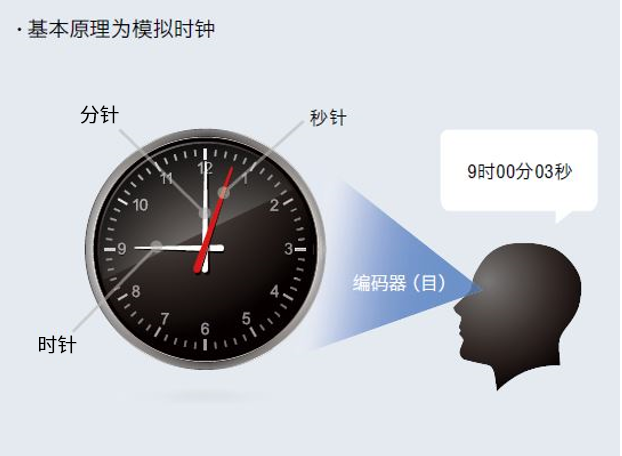 模擬時(shí)鐘根據(jù)秒針、分針、時(shí)針的位置測(cè)定當(dāng)前時(shí)間。ABZO編碼器相當(dāng)于搭載了4個(gè)相當(dāng)于時(shí)鐘時(shí)針的齒輪,通過識(shí)別這4個(gè)齒輪的角度來檢測(cè)位置信息。