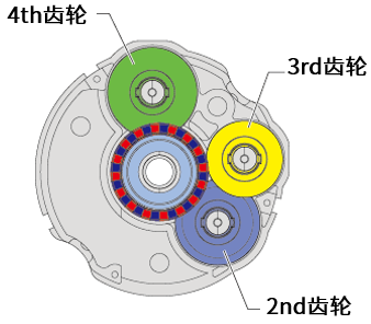 中心的電動(dòng)機(jī)軸上設(shè)有1個(gè)齒輪(1st齒輪),與該齒輪相連的有2列齒輪。 第1列齒輪由二級(jí)齒輪構(gòu)成(1st/2nd 齒輪、2nd/3rd齒輪),第2列齒輪由一級(jí)齒輪構(gòu)成(1st/4th齒輪)。