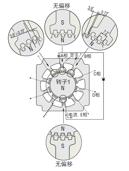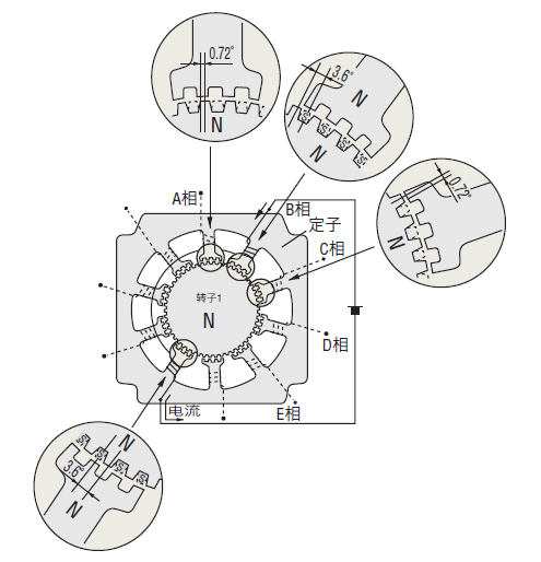 有A相至E相等5個(gè)相位的機(jī)型稱為5相步進(jìn)電動(dòng)機(jī)、有A相和B相2個(gè)相位的機(jī)型稱為2相步進(jìn)電動(dòng)機(jī)。