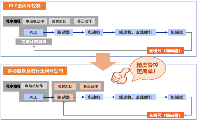 全閉環(huán)控制在一定程度上彌補(bǔ)因機(jī)械、裝配所影響的精度誤差。