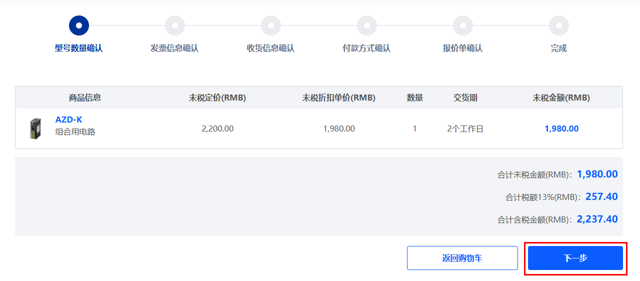 型號數(shù)量確認(rèn)無誤后,點擊“下一步”按鈕。