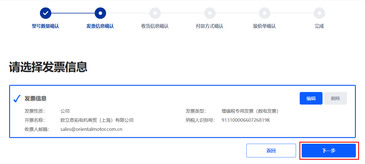 確認(rèn)發(fā)票信息后,點擊“下一步”按鈕。