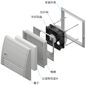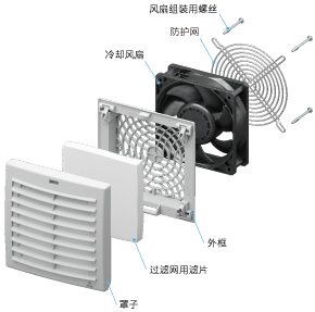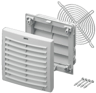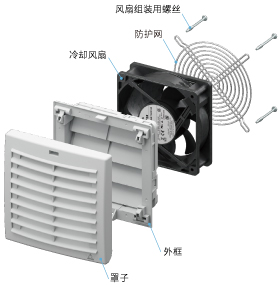 適用于電控柜的通風(fēng)和冷卻的面板、防護(hù)網(wǎng)、過(guò)濾網(wǎng)、螺絲的套件品。 請(qǐng)與我們的軸流風(fēng)扇(另售)配合使用。
