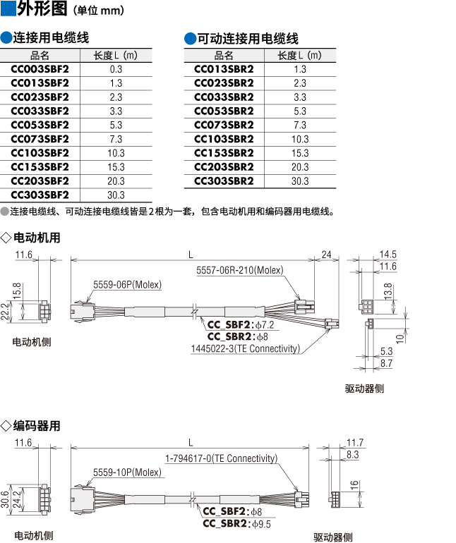 | 說明 | 電動機與驅(qū)動器間的可動連接電纜線。請于電纜線需反復(fù)彎曲時使用。套件包括電動機用電纜線和編碼器用電纜線。 2.3 m |