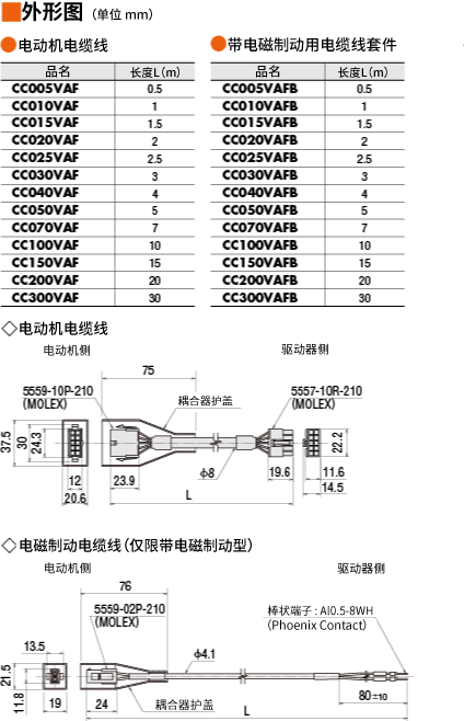 | 說明 | 電動機(jī)與驅(qū)動器間連接時(shí)必需的電動機(jī)用電纜線、電磁制動用電纜線套件。長度5 m |