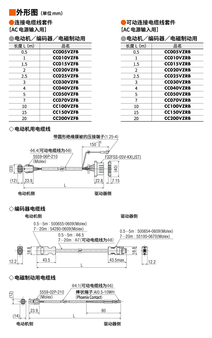 | 說明 | 電動機(jī)與驅(qū)動器間的可動電動機(jī)用電纜線、可動電磁制動用電纜線套件。請于電動機(jī)安裝在可動部,電纜線需彎曲時使用。長度5 m |