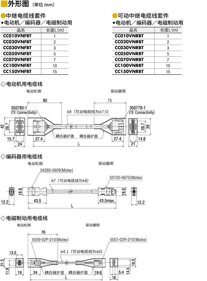 | 說明 | 電動(dòng)機(jī)與電纜線間中繼時(shí)必需的可動(dòng)電纜線。請(qǐng)于電動(dòng)機(jī)安裝在可動(dòng)部,電纜線需彎曲時(shí)使用。長(zhǎng)度10 m |