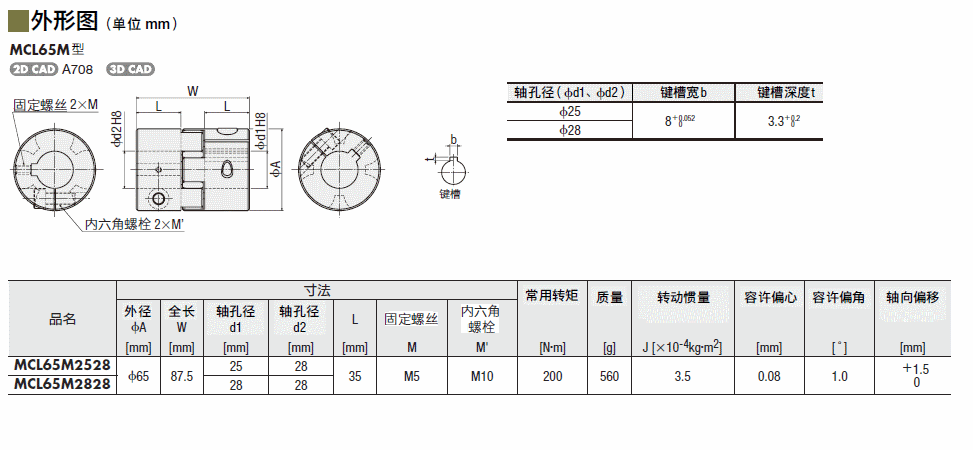 | 說明 | 外徑:65 mm、長度:87.5 mm、軸孔徑d1:28 mm、軸孔徑d2:28 mm |