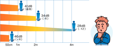 所以這點(diǎn)需要注意。噪音值和距離之間是有規(guī)律性的。例如,如果將測(cè)量距離從1m增加到2m進(jìn)行測(cè)量,噪音會(huì)下降6dB,如果距離增加到4m,則會(huì)再下降6dB,總共下降12dB。相反,如果測(cè)量距離從1m減少到50cm,噪音值會(huì)上升6dB。